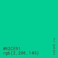 Цвет #02CE91 в цветовой модели RGB обозначается тремя октетами (2, 206, 145) в десятичном формате и #02CE91 в шестнадцатиричном (hex) формате, которые являются интенсивностью красного 2 (hex 02), интенсивность зелёного 206 (hex CE) и интенсивность синего 145 (hex 91).