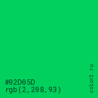 Цвет #02D05D в цветовой модели RGB обозначается тремя октетами (2, 208, 93) в десятичном формате и #02D05D в шестнадцатиричном (hex) формате, которые являются интенсивностью красного 2 (hex 02), интенсивность зелёного 208 (hex D0) и интенсивность синего 93 (hex 5D).