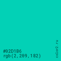Цвет #02D1B6 в цветовой модели RGB обозначается тремя октетами (2, 209, 182) в десятичном формате и #02D1B6 в шестнадцатиричном (hex) формате, которые являются интенсивностью красного 2 (hex 02), интенсивность зелёного 209 (hex D1) и интенсивность синего 182 (hex B6).