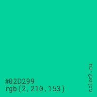 Цвет #02D299 в цветовой модели RGB обозначается тремя октетами (2, 210, 153) в десятичном формате и #02D299 в шестнадцатиричном (hex) формате, которые являются интенсивностью красного 2 (hex 02), интенсивность зелёного 210 (hex D2) и интенсивность синего 153 (hex 99).