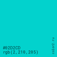 Цвет #02D2CD в цветовой модели RGB обозначается тремя октетами (2, 210, 205) в десятичном формате и #02D2CD в шестнадцатиричном (hex) формате, которые являются интенсивностью красного 2 (hex 02), интенсивность зелёного 210 (hex D2) и интенсивность синего 205 (hex CD).