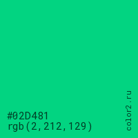 Цвет #02D481 в цветовой модели RGB обозначается тремя октетами (2, 212, 129) в десятичном формате и #02D481 в шестнадцатиричном (hex) формате, которые являются интенсивностью красного 2 (hex 02), интенсивность зелёного 212 (hex D4) и интенсивность синего 129 (hex 81).