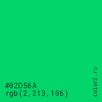 Цвет #02D56A в цветовой модели RGB обозначается тремя октетами (2, 213, 106) в десятичном формате и #02D56A в шестнадцатиричном (hex) формате, которые являются интенсивностью красного 2 (hex 02), интенсивность зелёного 213 (hex D5) и интенсивность синего 106 (hex 6A).