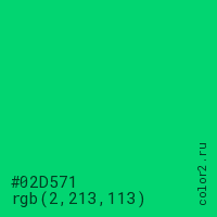 Цвет #02D571 в цветовой модели RGB обозначается тремя октетами (2, 213, 113) в десятичном формате и #02D571 в шестнадцатиричном (hex) формате, которые являются интенсивностью красного 2 (hex 02), интенсивность зелёного 213 (hex D5) и интенсивность синего 113 (hex 71).