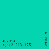 Цвет #02D5AF в цветовой модели RGB обозначается тремя октетами (2, 213, 175) в десятичном формате и #02D5AF в шестнадцатиричном (hex) формате, которые являются интенсивностью красного 2 (hex 02), интенсивность зелёного 213 (hex D5) и интенсивность синего 175 (hex AF).