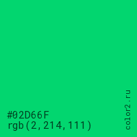 Цвет #02D66F в цветовой модели RGB обозначается тремя октетами (2, 214, 111) в десятичном формате и #02D66F в шестнадцатиричном (hex) формате, которые являются интенсивностью красного 2 (hex 02), интенсивность зелёного 214 (hex D6) и интенсивность синего 111 (hex 6F).