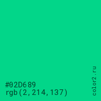 Цвет #02D689 в цветовой модели RGB обозначается тремя октетами (2, 214, 137) в десятичном формате и #02D689 в шестнадцатиричном (hex) формате, которые являются интенсивностью красного 2 (hex 02), интенсивность зелёного 214 (hex D6) и интенсивность синего 137 (hex 89).