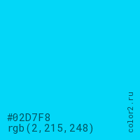 Цвет #02D7F8 в цветовой модели RGB обозначается тремя октетами (2, 215, 248) в десятичном формате и #02D7F8 в шестнадцатиричном (hex) формате, которые являются интенсивностью красного 2 (hex 02), интенсивность зелёного 215 (hex D7) и интенсивность синего 248 (hex F8).