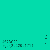 Цвет #02DCAB в цветовой модели RGB обозначается тремя октетами (2, 220, 171) в десятичном формате и #02DCAB в шестнадцатиричном (hex) формате, которые являются интенсивностью красного 2 (hex 02), интенсивность зелёного 220 (hex DC) и интенсивность синего 171 (hex AB).