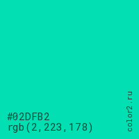 Цвет #02DFB2 в цветовой модели RGB обозначается тремя октетами (2, 223, 178) в десятичном формате и #02DFB2 в шестнадцатиричном (hex) формате, которые являются интенсивностью красного 2 (hex 02), интенсивность зелёного 223 (hex DF) и интенсивность синего 178 (hex B2).