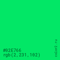 Цвет #02E766 в цветовой модели RGB обозначается тремя октетами (2, 231, 102) в десятичном формате и #02E766 в шестнадцатиричном (hex) формате, которые являются интенсивностью красного 2 (hex 02), интенсивность зелёного 231 (hex E7) и интенсивность синего 102 (hex 66).