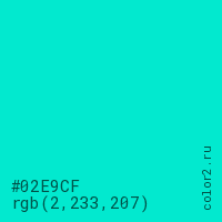 Цвет #02E9CF в цветовой модели RGB обозначается тремя октетами (2, 233, 207) в десятичном формате и #02E9CF в шестнадцатиричном (hex) формате, которые являются интенсивностью красного 2 (hex 02), интенсивность зелёного 233 (hex E9) и интенсивность синего 207 (hex CF).