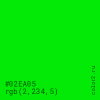 Цвет #02EA05 в цветовой модели RGB обозначается тремя октетами (2, 234, 5) в десятичном формате и #02EA05 в шестнадцатиричном (hex) формате, которые являются интенсивностью красного 2 (hex 02), интенсивность зелёного 234 (hex EA) и интенсивность синего 5 (hex 05).