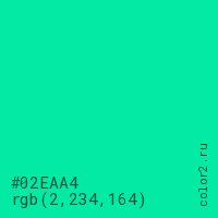 Цвет #02EAA4 в цветовой модели RGB обозначается тремя октетами (2, 234, 164) в десятичном формате и #02EAA4 в шестнадцатиричном (hex) формате, которые являются интенсивностью красного 2 (hex 02), интенсивность зелёного 234 (hex EA) и интенсивность синего 164 (hex A4).