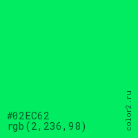Цвет #02EC62 в цветовой модели RGB обозначается тремя октетами (2, 236, 98) в десятичном формате и #02EC62 в шестнадцатиричном (hex) формате, которые являются интенсивностью красного 2 (hex 02), интенсивность зелёного 236 (hex EC) и интенсивность синего 98 (hex 62).