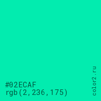 Цвет #02ECAF в цветовой модели RGB обозначается тремя октетами (2, 236, 175) в десятичном формате и #02ECAF в шестнадцатиричном (hex) формате, которые являются интенсивностью красного 2 (hex 02), интенсивность зелёного 236 (hex EC) и интенсивность синего 175 (hex AF).