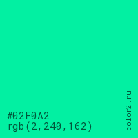 Цвет #02F0A2 в цветовой модели RGB обозначается тремя октетами (2, 240, 162) в десятичном формате и #02F0A2 в шестнадцатиричном (hex) формате, которые являются интенсивностью красного 2 (hex 02), интенсивность зелёного 240 (hex F0) и интенсивность синего 162 (hex A2).