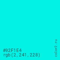 Цвет #02F1E4 в цветовой модели RGB обозначается тремя октетами (2, 241, 228) в десятичном формате и #02F1E4 в шестнадцатиричном (hex) формате, которые являются интенсивностью красного 2 (hex 02), интенсивность зелёного 241 (hex F1) и интенсивность синего 228 (hex E4).