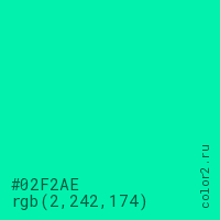 Цвет #02F2AE в цветовой модели RGB обозначается тремя октетами (2, 242, 174) в десятичном формате и #02F2AE в шестнадцатиричном (hex) формате, которые являются интенсивностью красного 2 (hex 02), интенсивность зелёного 242 (hex F2) и интенсивность синего 174 (hex AE).