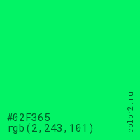 Цвет #02F365 в цветовой модели RGB обозначается тремя октетами (2, 243, 101) в десятичном формате и #02F365 в шестнадцатиричном (hex) формате, которые являются интенсивностью красного 2 (hex 02), интенсивность зелёного 243 (hex F3) и интенсивность синего 101 (hex 65).