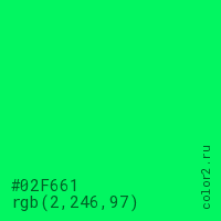 Цвет #02F661 в цветовой модели RGB обозначается тремя октетами (2, 246, 97) в десятичном формате и #02F661 в шестнадцатиричном (hex) формате, которые являются интенсивностью красного 2 (hex 02), интенсивность зелёного 246 (hex F6) и интенсивность синего 97 (hex 61).