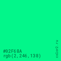 Цвет #02F68A в цветовой модели RGB обозначается тремя октетами (2, 246, 138) в десятичном формате и #02F68A в шестнадцатиричном (hex) формате, которые являются интенсивностью красного 2 (hex 02), интенсивность зелёного 246 (hex F6) и интенсивность синего 138 (hex 8A).