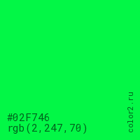 Цвет #02F746 в цветовой модели RGB обозначается тремя октетами (2, 247, 70) в десятичном формате и #02F746 в шестнадцатиричном (hex) формате, которые являются интенсивностью красного 2 (hex 02), интенсивность зелёного 247 (hex F7) и интенсивность синего 70 (hex 46).