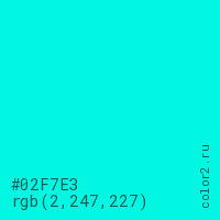 Цвет #02F7E3 в цветовой модели RGB обозначается тремя октетами (2, 247, 227) в десятичном формате и #02F7E3 в шестнадцатиричном (hex) формате, которые являются интенсивностью красного 2 (hex 02), интенсивность зелёного 247 (hex F7) и интенсивность синего 227 (hex E3).