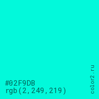 Цвет #02F9DB в цветовой модели RGB обозначается тремя октетами (2, 249, 219) в десятичном формате и #02F9DB в шестнадцатиричном (hex) формате, которые являются интенсивностью красного 2 (hex 02), интенсивность зелёного 249 (hex F9) и интенсивность синего 219 (hex DB).