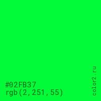 Цвет #02FB37 в цветовой модели RGB обозначается тремя октетами (2, 251, 55) в десятичном формате и #02FB37 в шестнадцатиричном (hex) формате, которые являются интенсивностью красного 2 (hex 02), интенсивность зелёного 251 (hex FB) и интенсивность синего 55 (hex 37).