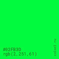 Цвет #02FB3D в цветовой модели RGB обозначается тремя октетами (2, 251, 61) в десятичном формате и #02FB3D в шестнадцатиричном (hex) формате, которые являются интенсивностью красного 2 (hex 02), интенсивность зелёного 251 (hex FB) и интенсивность синего 61 (hex 3D).