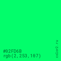 Цвет #02FD6B в цветовой модели RGB обозначается тремя октетами (2, 253, 107) в десятичном формате и #02FD6B в шестнадцатиричном (hex) формате, которые являются интенсивностью красного 2 (hex 02), интенсивность зелёного 253 (hex FD) и интенсивность синего 107 (hex 6B).