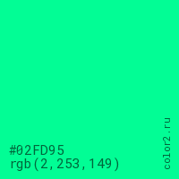 Цвет #02FD95 в цветовой модели RGB обозначается тремя октетами (2, 253, 149) в десятичном формате и #02FD95 в шестнадцатиричном (hex) формате, которые являются интенсивностью красного 2 (hex 02), интенсивность зелёного 253 (hex FD) и интенсивность синего 149 (hex 95).