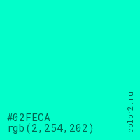 Цвет #02FECA в цветовой модели RGB обозначается тремя октетами (2, 254, 202) в десятичном формате и #02FECA в шестнадцатиричном (hex) формате, которые являются интенсивностью красного 2 (hex 02), интенсивность зелёного 254 (hex FE) и интенсивность синего 202 (hex CA).
