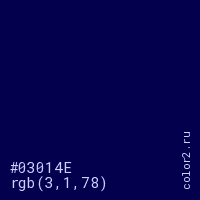 Цвет #03014E в цветовой модели RGB обозначается тремя октетами (3, 1, 78) в десятичном формате и #03014E в шестнадцатиричном (hex) формате, которые являются интенсивностью красного 3 (hex 03), интенсивность зелёного 1 (hex 01) и интенсивность синего 78 (hex 4E).