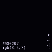 Цвет #030207 в цветовой модели RGB обозначается тремя октетами (3, 2, 7) в десятичном формате и #030207 в шестнадцатиричном (hex) формате, которые являются интенсивностью красного 3 (hex 03), интенсивность зелёного 2 (hex 02) и интенсивность синего 7 (hex 07).