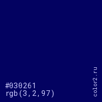 Цвет #030261 в цветовой модели RGB обозначается тремя октетами (3, 2, 97) в десятичном формате и #030261 в шестнадцатиричном (hex) формате, которые являются интенсивностью красного 3 (hex 03), интенсивность зелёного 2 (hex 02) и интенсивность синего 97 (hex 61).