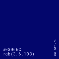 Цвет #03066C в цветовой модели RGB обозначается тремя октетами (3, 6, 108) в десятичном формате и #03066C в шестнадцатиричном (hex) формате, которые являются интенсивностью красного 3 (hex 03), интенсивность зелёного 6 (hex 06) и интенсивность синего 108 (hex 6C).