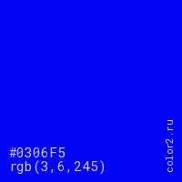 Цвет #0306F5 в цветовой модели RGB обозначается тремя октетами (3, 6, 245) в десятичном формате и #0306F5 в шестнадцатиричном (hex) формате, которые являются интенсивностью красного 3 (hex 03), интенсивность зелёного 6 (hex 06) и интенсивность синего 245 (hex F5).