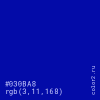 Цвет #030BA8 в цветовой модели RGB обозначается тремя октетами (3, 11, 168) в десятичном формате и #030BA8 в шестнадцатиричном (hex) формате, которые являются интенсивностью красного 3 (hex 03), интенсивность зелёного 11 (hex 0B) и интенсивность синего 168 (hex A8).