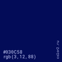 Цвет #030C58 в цветовой модели RGB обозначается тремя октетами (3, 12, 88) в десятичном формате и #030C58 в шестнадцатиричном (hex) формате, которые являются интенсивностью красного 3 (hex 03), интенсивность зелёного 12 (hex 0C) и интенсивность синего 88 (hex 58).