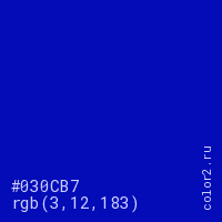 Цвет #030CB7 в цветовой модели RGB обозначается тремя октетами (3, 12, 183) в десятичном формате и #030CB7 в шестнадцатиричном (hex) формате, которые являются интенсивностью красного 3 (hex 03), интенсивность зелёного 12 (hex 0C) и интенсивность синего 183 (hex B7).