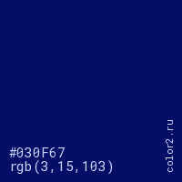 Цвет #030F67 в цветовой модели RGB обозначается тремя октетами (3, 15, 103) в десятичном формате и #030F67 в шестнадцатиричном (hex) формате, которые являются интенсивностью красного 3 (hex 03), интенсивность зелёного 15 (hex 0F) и интенсивность синего 103 (hex 67).