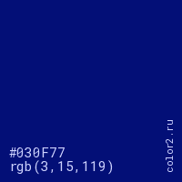 Цвет #030F77 в цветовой модели RGB обозначается тремя октетами (3, 15, 119) в десятичном формате и #030F77 в шестнадцатиричном (hex) формате, которые являются интенсивностью красного 3 (hex 03), интенсивность зелёного 15 (hex 0F) и интенсивность синего 119 (hex 77).