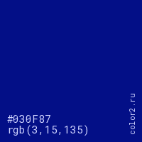 Цвет #030F87 в цветовой модели RGB обозначается тремя октетами (3, 15, 135) в десятичном формате и #030F87 в шестнадцатиричном (hex) формате, которые являются интенсивностью красного 3 (hex 03), интенсивность зелёного 15 (hex 0F) и интенсивность синего 135 (hex 87).