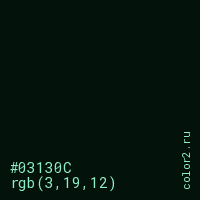 Цвет #03130C в цветовой модели RGB обозначается тремя октетами (3, 19, 12) в десятичном формате и #03130C в шестнадцатиричном (hex) формате, которые являются интенсивностью красного 3 (hex 03), интенсивность зелёного 19 (hex 13) и интенсивность синего 12 (hex 0C).
