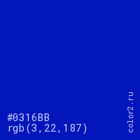 Цвет #0316BB в цветовой модели RGB обозначается тремя октетами (3, 22, 187) в десятичном формате и #0316BB в шестнадцатиричном (hex) формате, которые являются интенсивностью красного 3 (hex 03), интенсивность зелёного 22 (hex 16) и интенсивность синего 187 (hex BB).