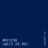 Цвет #031C50 в цветовой модели RGB обозначается тремя октетами (3, 28, 80) в десятичном формате и #031C50 в шестнадцатиричном (hex) формате, которые являются интенсивностью красного 3 (hex 03), интенсивность зелёного 28 (hex 1C) и интенсивность синего 80 (hex 50).