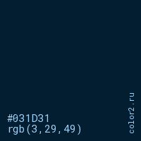 Цвет #031D31 в цветовой модели RGB обозначается тремя октетами (3, 29, 49) в десятичном формате и #031D31 в шестнадцатиричном (hex) формате, которые являются интенсивностью красного 3 (hex 03), интенсивность зелёного 29 (hex 1D) и интенсивность синего 49 (hex 31).