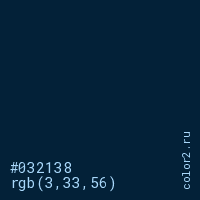 Цвет #032138 в цветовой модели RGB обозначается тремя октетами (3, 33, 56) в десятичном формате и #032138 в шестнадцатиричном (hex) формате, которые являются интенсивностью красного 3 (hex 03), интенсивность зелёного 33 (hex 21) и интенсивность синего 56 (hex 38).